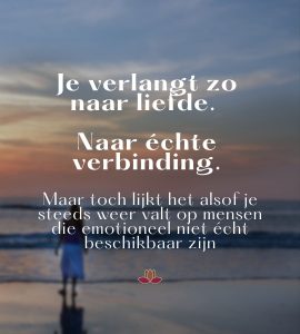 Misschien herken je dit wel… Je verlangt zo naar liefde. Naar échte verbinding. Iemand bij wie je jezelf mag zijn. Maar toch lijkt het alsof je steeds weer valt op mensen die emotioneel niet écht beschikbaar zijn. Ze zijn er wel… maar ook weer niet. Ze trekken zich terug zodra jij je kwetsbaar opstelt. Ze