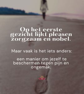 Pleasen lijkt lief… maar is het dat echt? Op het eerste gezicht lijkt pleasen zorgzaam en nobel. Maar vaak is het iets anders: een manier om jezelf te beschermen tegen pijn en ongemak. Je zegt ‘ja’ terwijl je eigenlijk ‘nee’ bedoelt. Je past je aan, je zorgt voor de ander, je redt en draagt. Maar diep